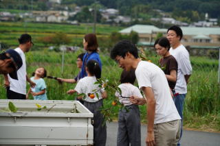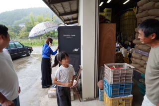 | 雨の中、新米受け取りに来たメンバーに柿の実をプレゼント。久保柿といって小さいけれど甘い。 | オーナーにとってはお孫さんのようなもの。忙しい仕事にも関わらず、いつも笑顔で優しい眼差しを向けてくれるカッコいいオジサンです。 |
